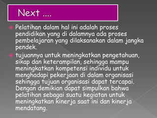 Pembahasan sekitar target dan sasaran pendidikan dan peluang serta kesempatan belajar. Pengertian Pendidikan dan Pelatihan Diklat Secara garis besar pendidikan dan pelatihan Diklat dapat diartikan sebagai akuisisi dari pengetahuan knowledge keterampilan skills dan sikap attitudes yang memampukan manusia untuk mencapai tujuan individual dan organisasi saat ini dan di masa depan Bambrough 19981. Sejalan dengan definisi di atas Sukmadinata 20041 juga mengemukan pendidikan sebagai upaya-upaya yakni upaya mencerdaskan bangsa menanamkan.